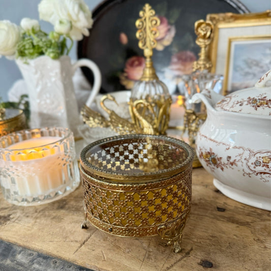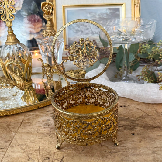 Vintage Ormolu Style Hollywood Regency Footed Circular Jewelry Box