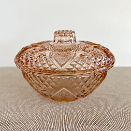 Vintage Pink KIG Malaysia Pressed Glass Roses Covered Candy Dish