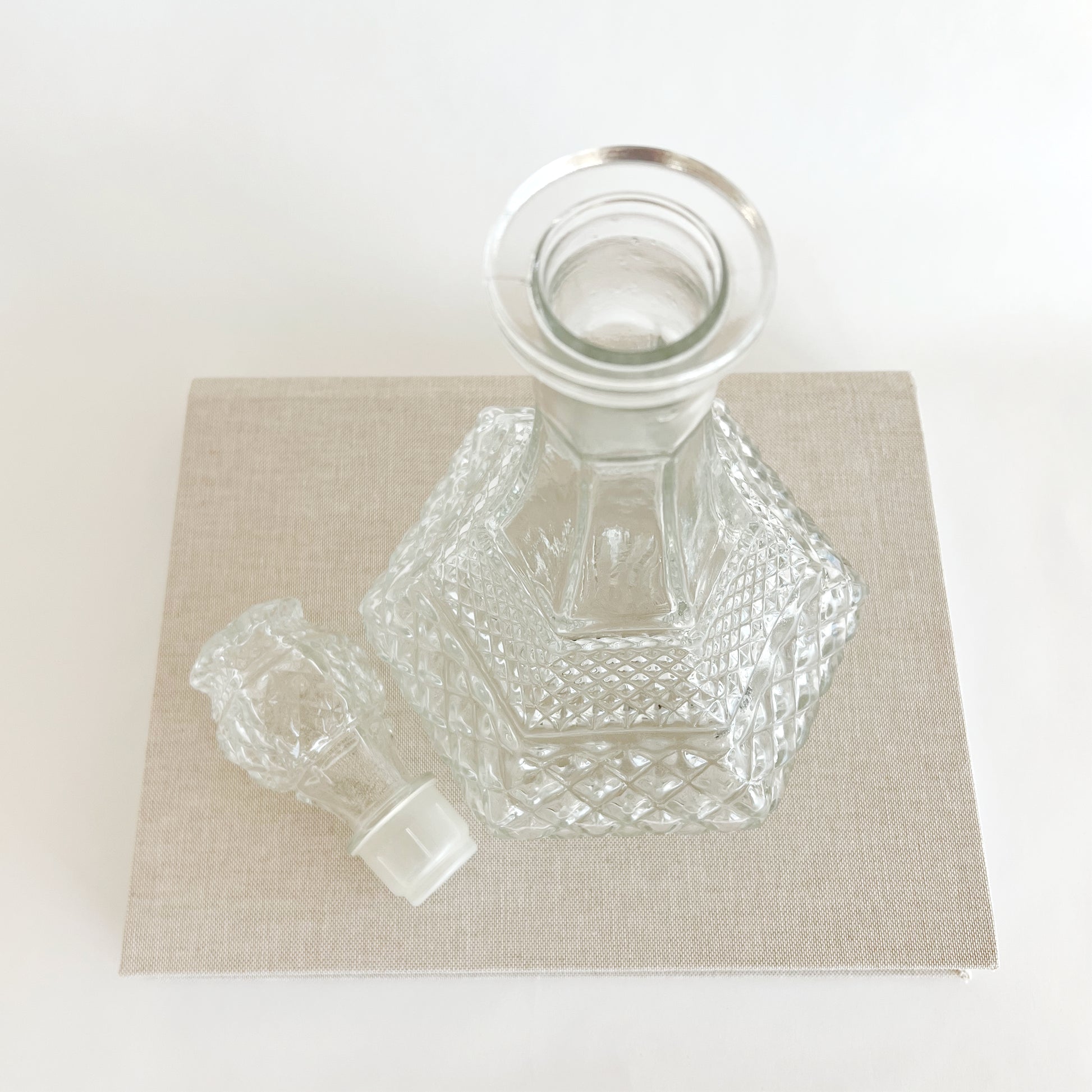 This Vintage Anchor Hocking Wexford Ships Decanter & Stopper is a sturdy classic with beautiful diamond pressed glass details. Great mid century style would make a charming addition to your bar cart or collection. Pressed glass, made in the USA, discontinued piece. Great vintage condition, with no visible damage.