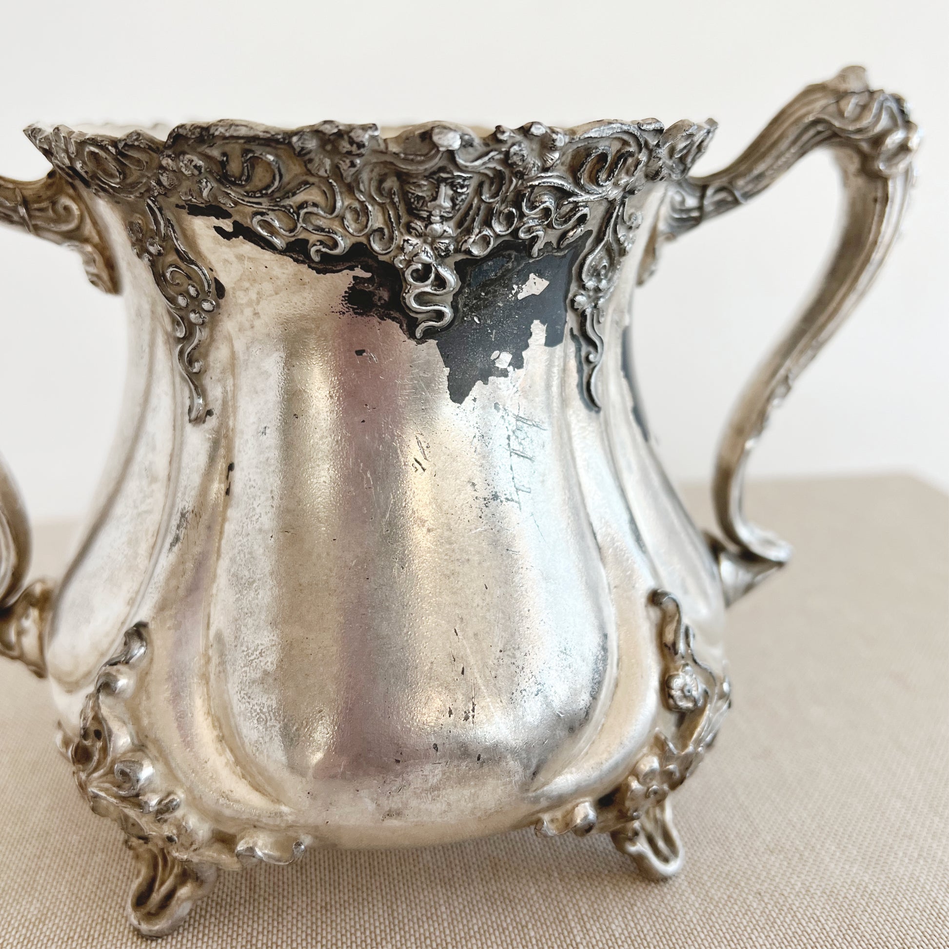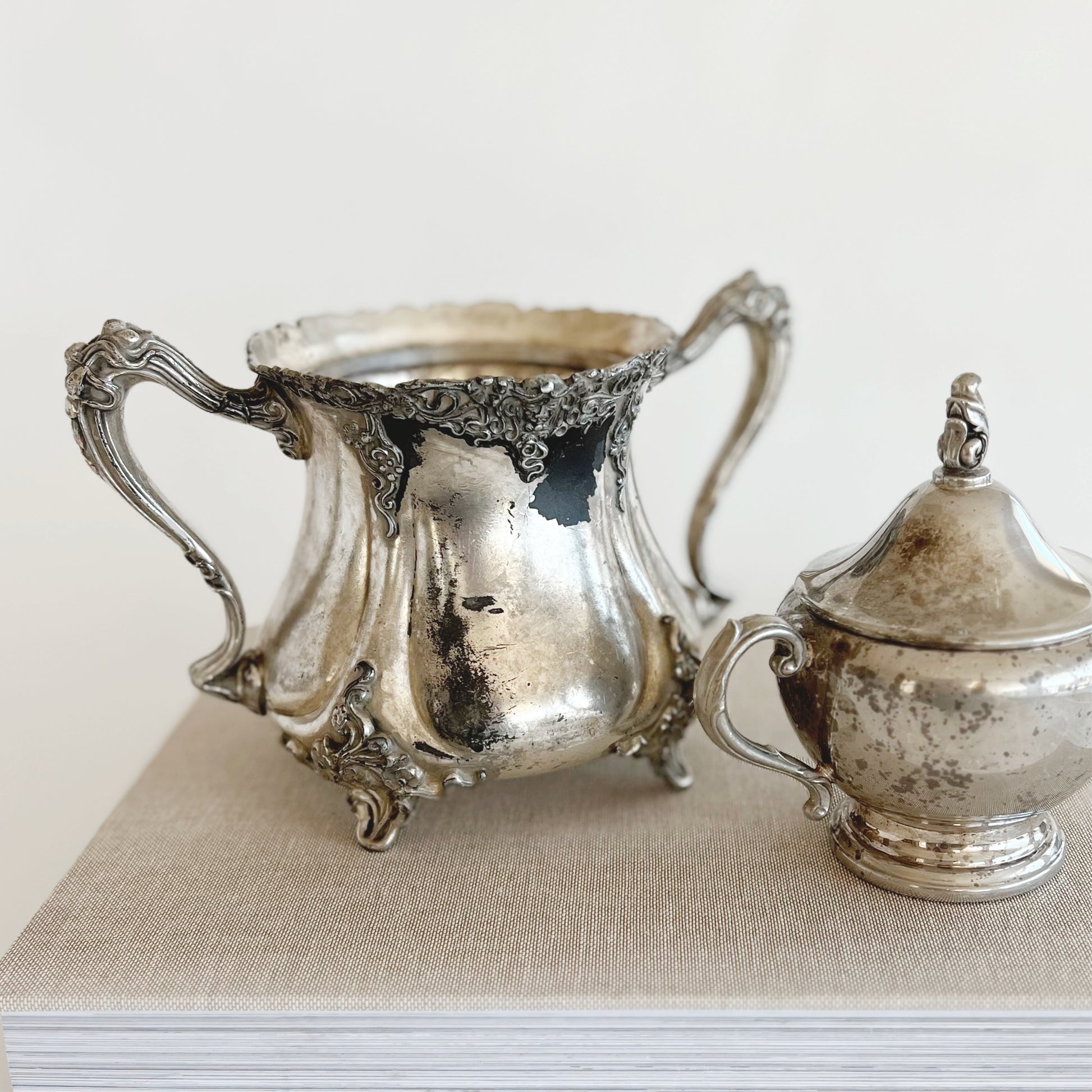 Note: Very weathered and tarnished, as shown in photos. Silver plate is peeling away in parts, revealing dark gray metal beneath. Silver is dull and blotchy.