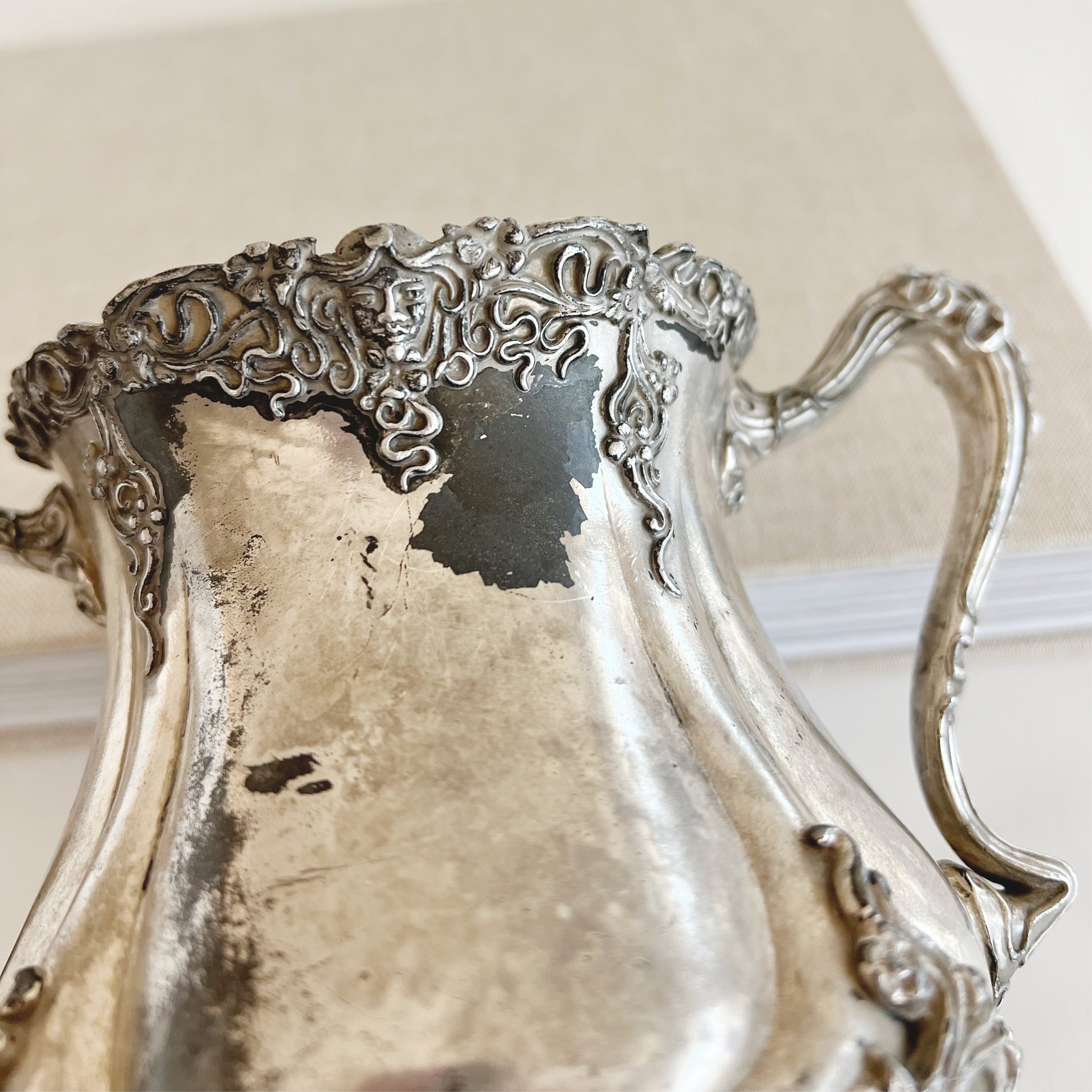 This Antique E.G. Webster and Son Quadruple Plate 2-Handled Container is an unusual and interesting piece. It has intricate vine and serpent-like patterns which surround a face in the center of the rim on each side. It is over 100 years old and would make an great conversation piece with its very well aged, antique patina and details. Mark on the bottom has a W inside a star and web, signifying the maker as E.G. Webster & Son of New York City. Also states: “Quadruple Plate Des Pat Aug 25 03. 95.