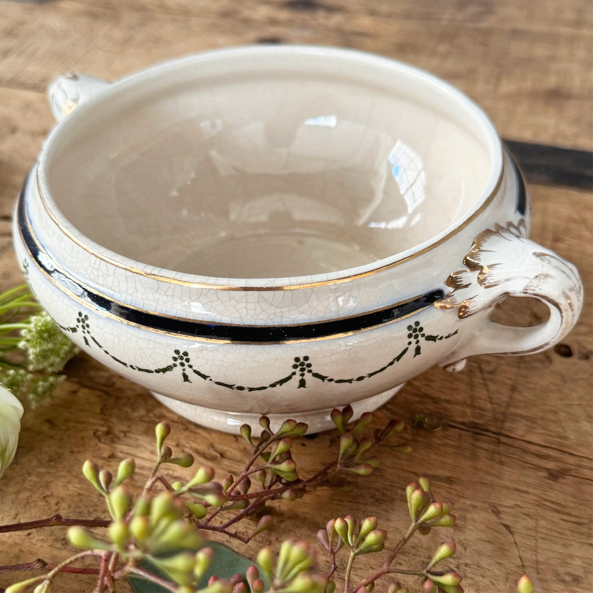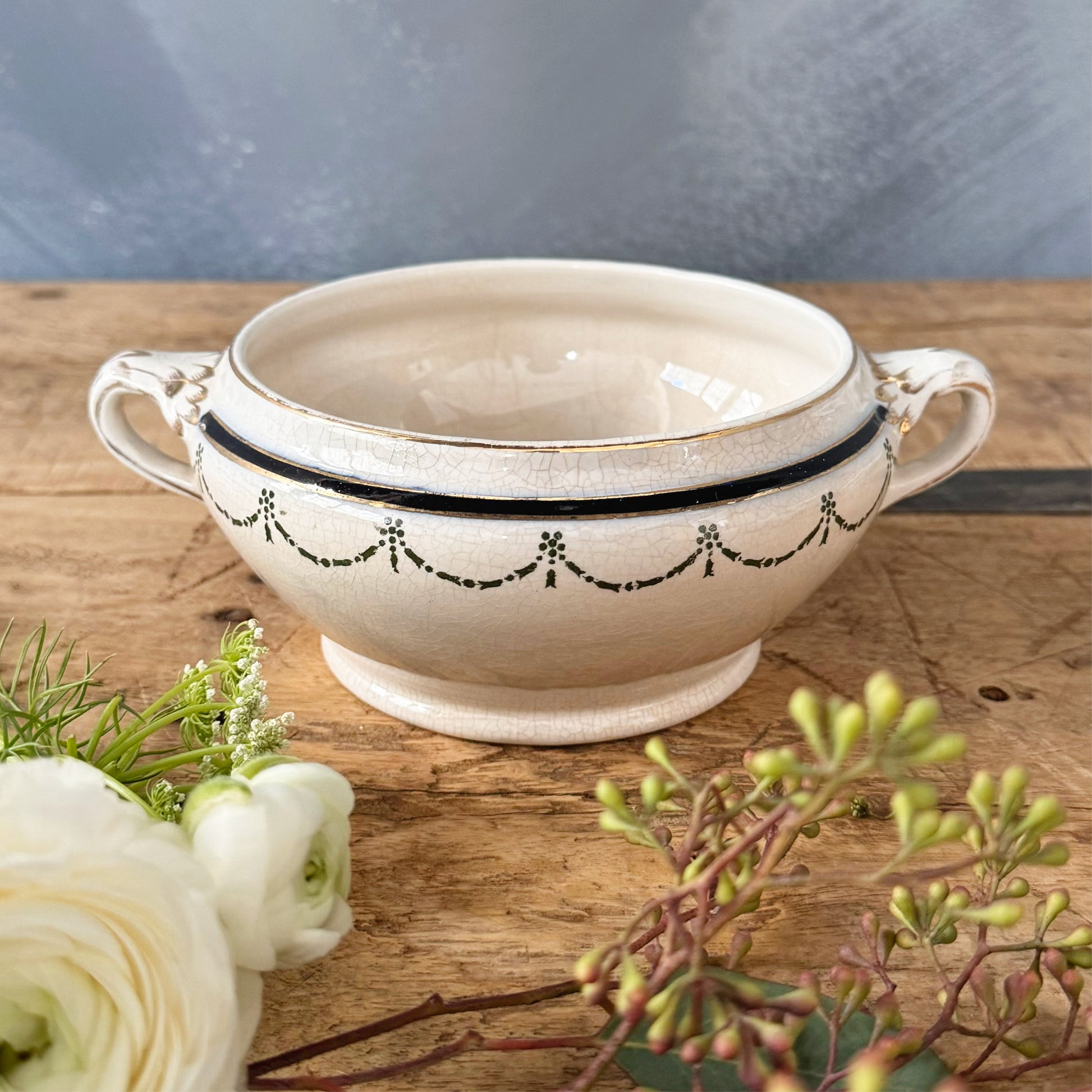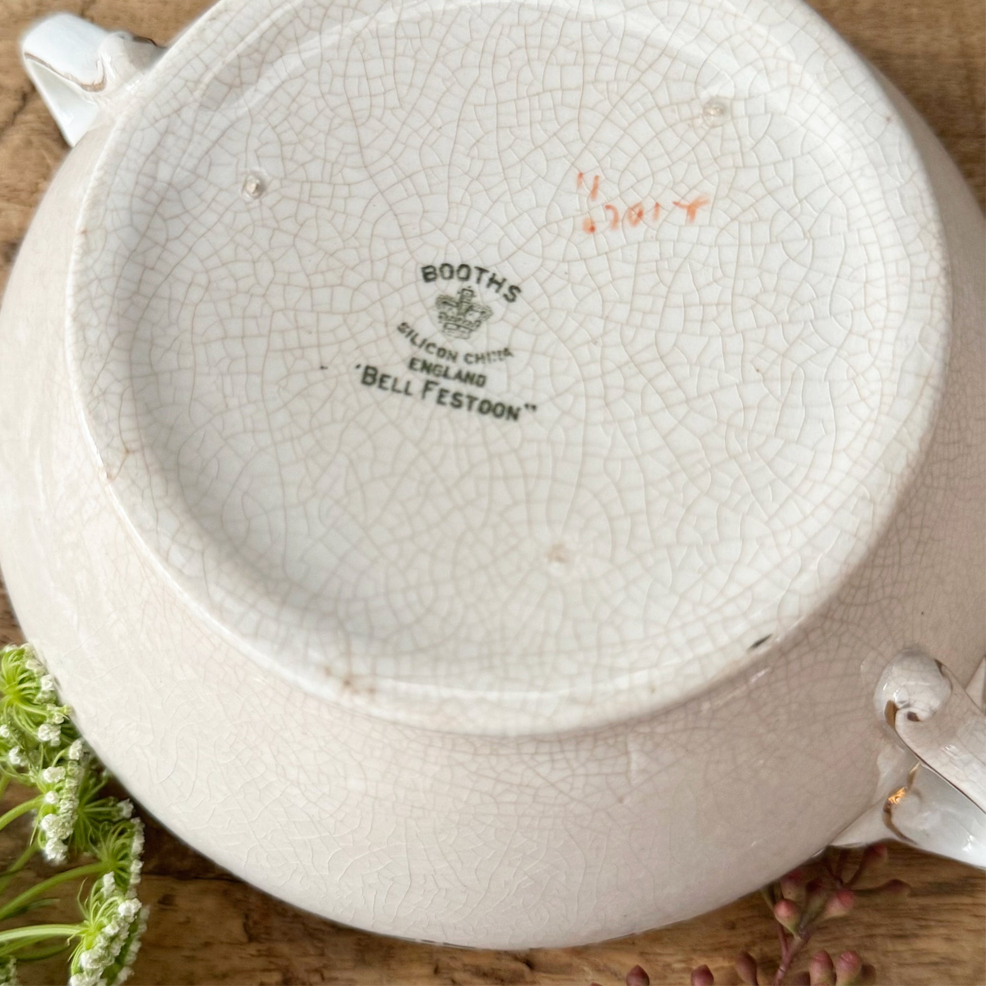 This charming Antique Booths England Silicon China Bell Festoon Dish has an aged patina that lends so much character to this dainty piece. Beautiful dark green garland and gold details adorn the rim. It would look lovely housing a pillar candle and festive greens - a beautiful addition to your holiday tablescape and beyond.