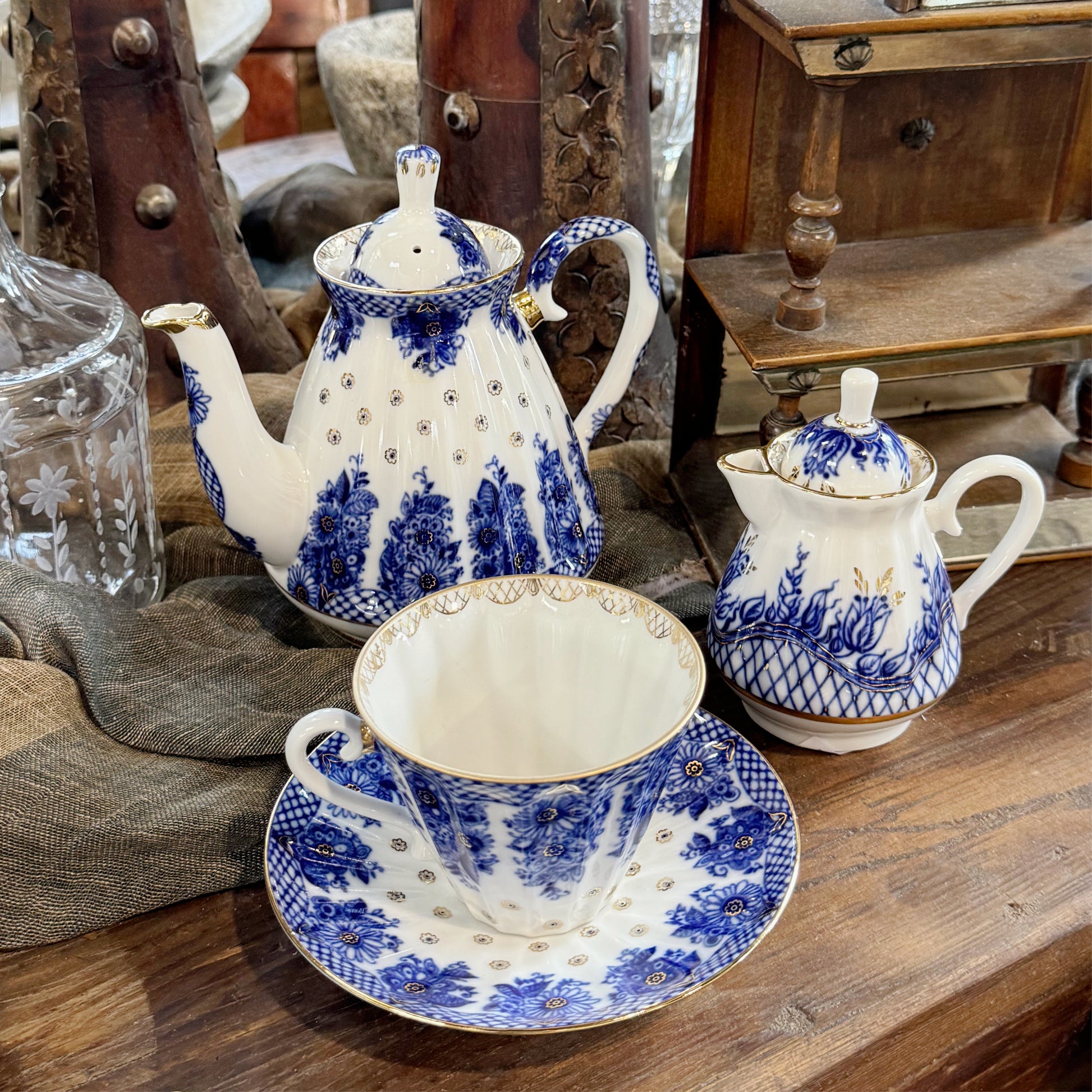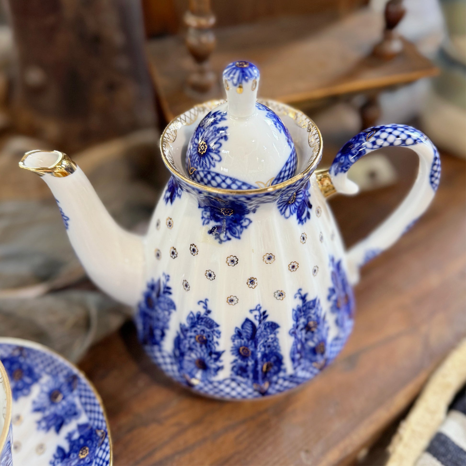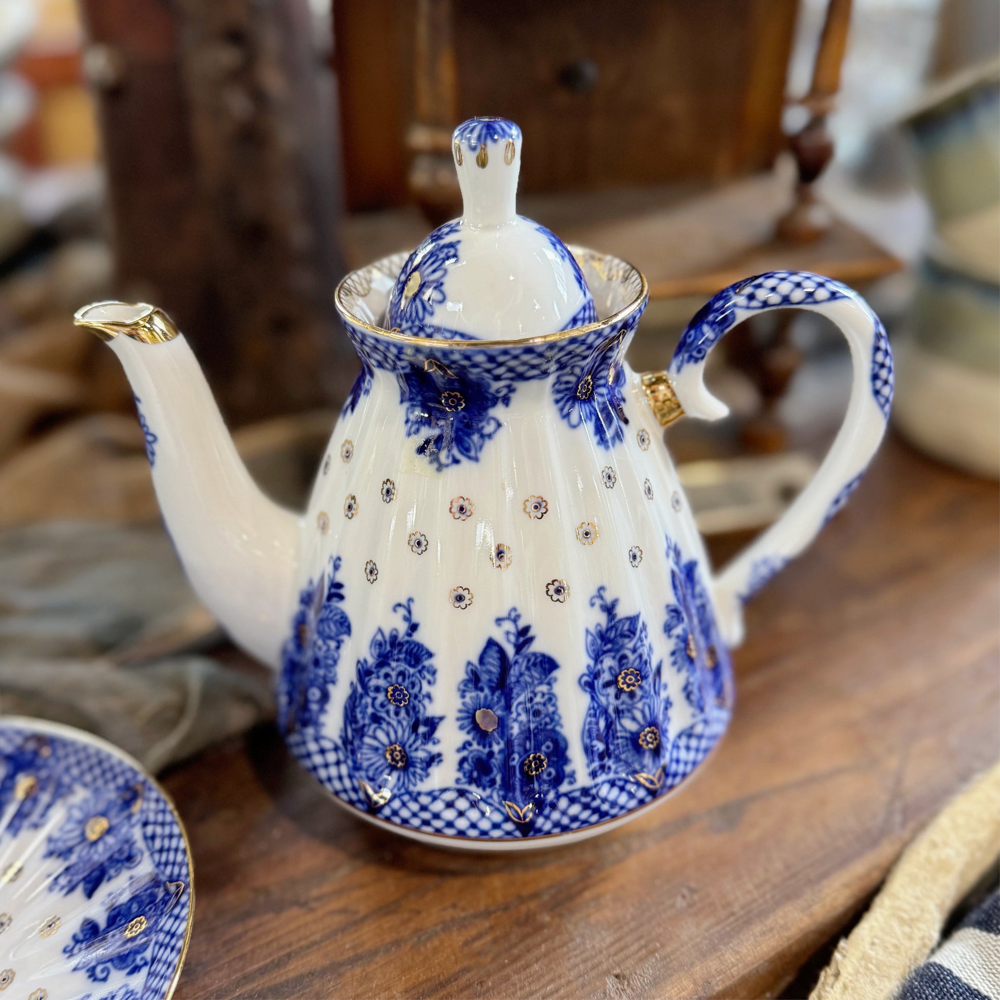 Exquisute Antique Imperial Russian Lomonosov Porcelain Tea Pot with blue and gold details. In excellent vintage condition.
