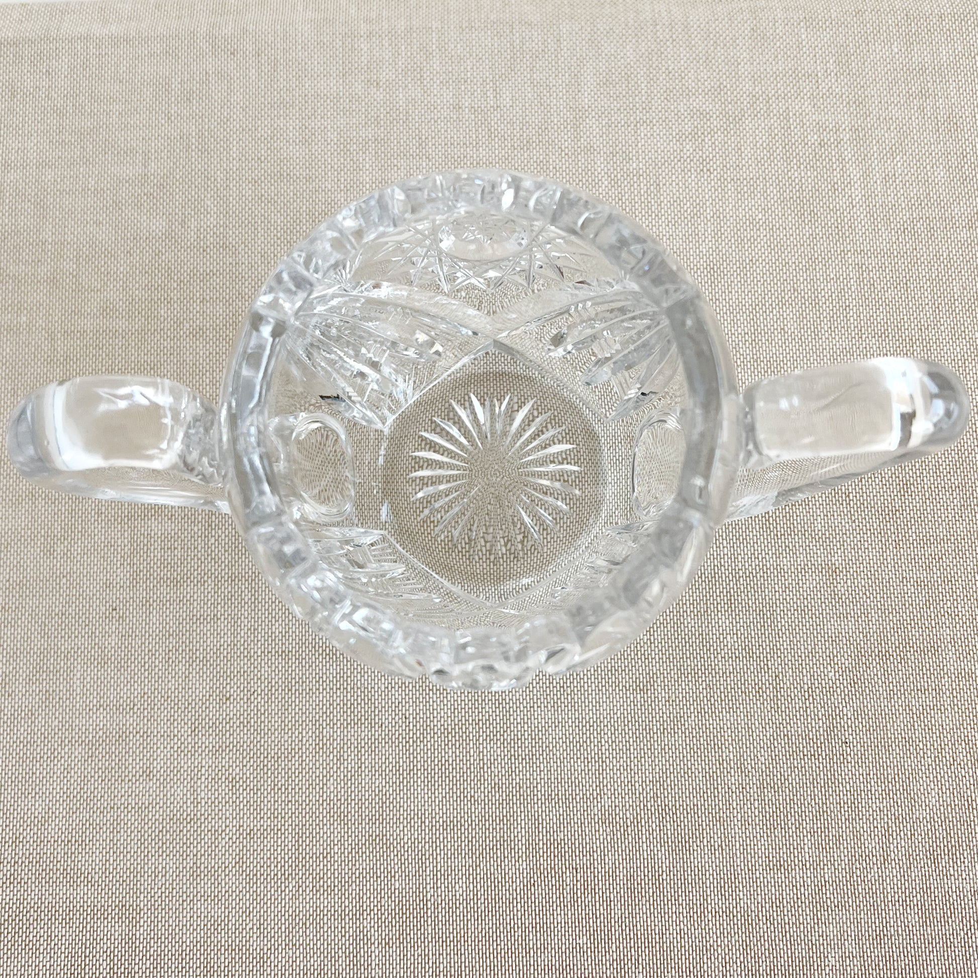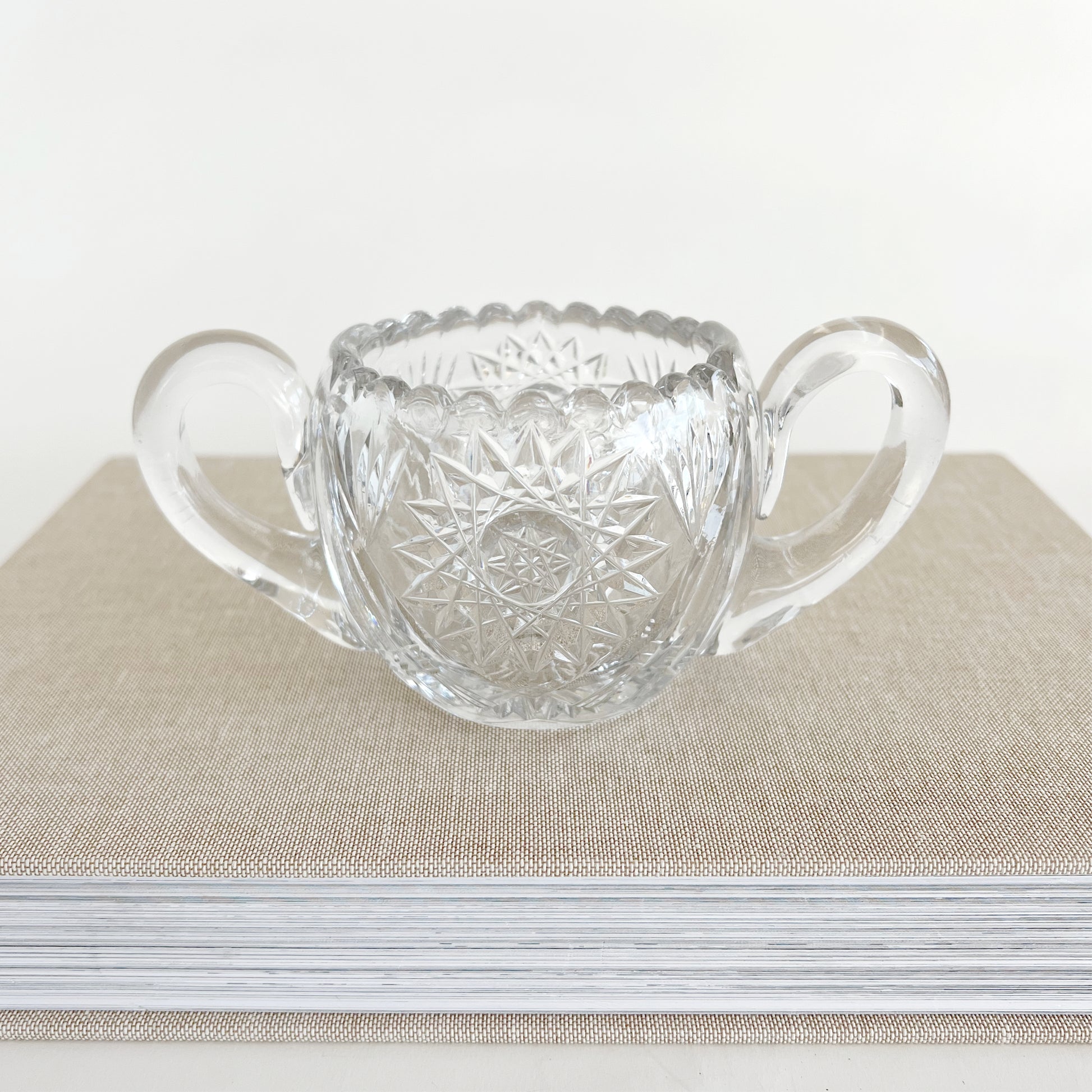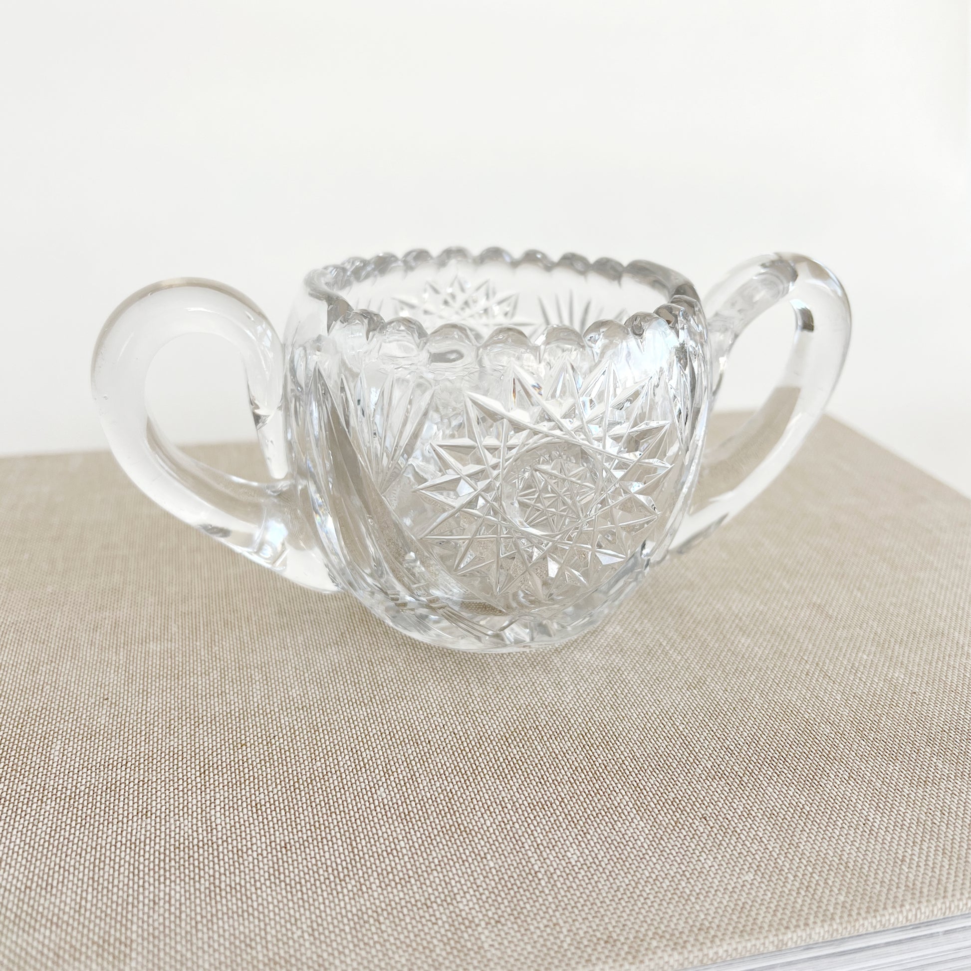 A classic Antique American Brilliant Cut Glass Pinwheel Sugar Bowl, this piece is heavy with beautiful pinwheel cut glass details, a scalloped edge, and sturdy handles. Large enough to be functional for many purposes in your home: to hold candles, matches, jewelry, keys, cotton balls, or other small items. Made in the US from 1880 to WW1.