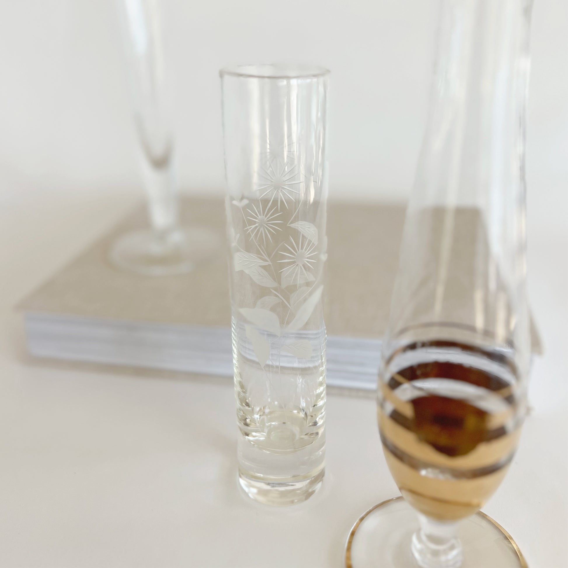 With beautiful mid-century style and a slender silhouette, this Vintage Bud Vase has delicate cut details of starburst flowers with stems and leaves. Sturdy cylindrical shape. No visible damage to glass.