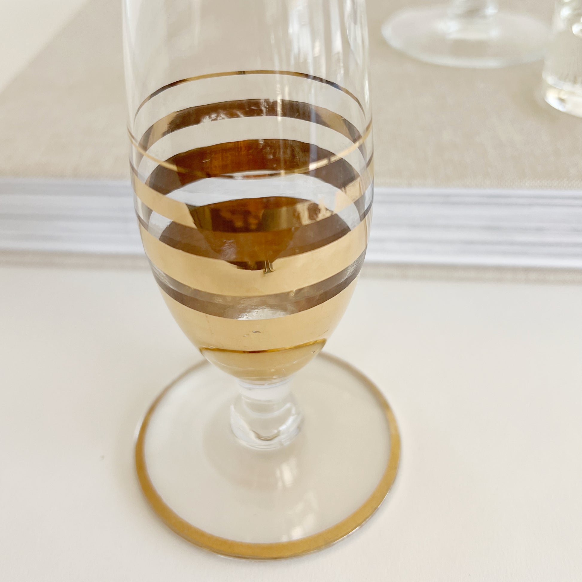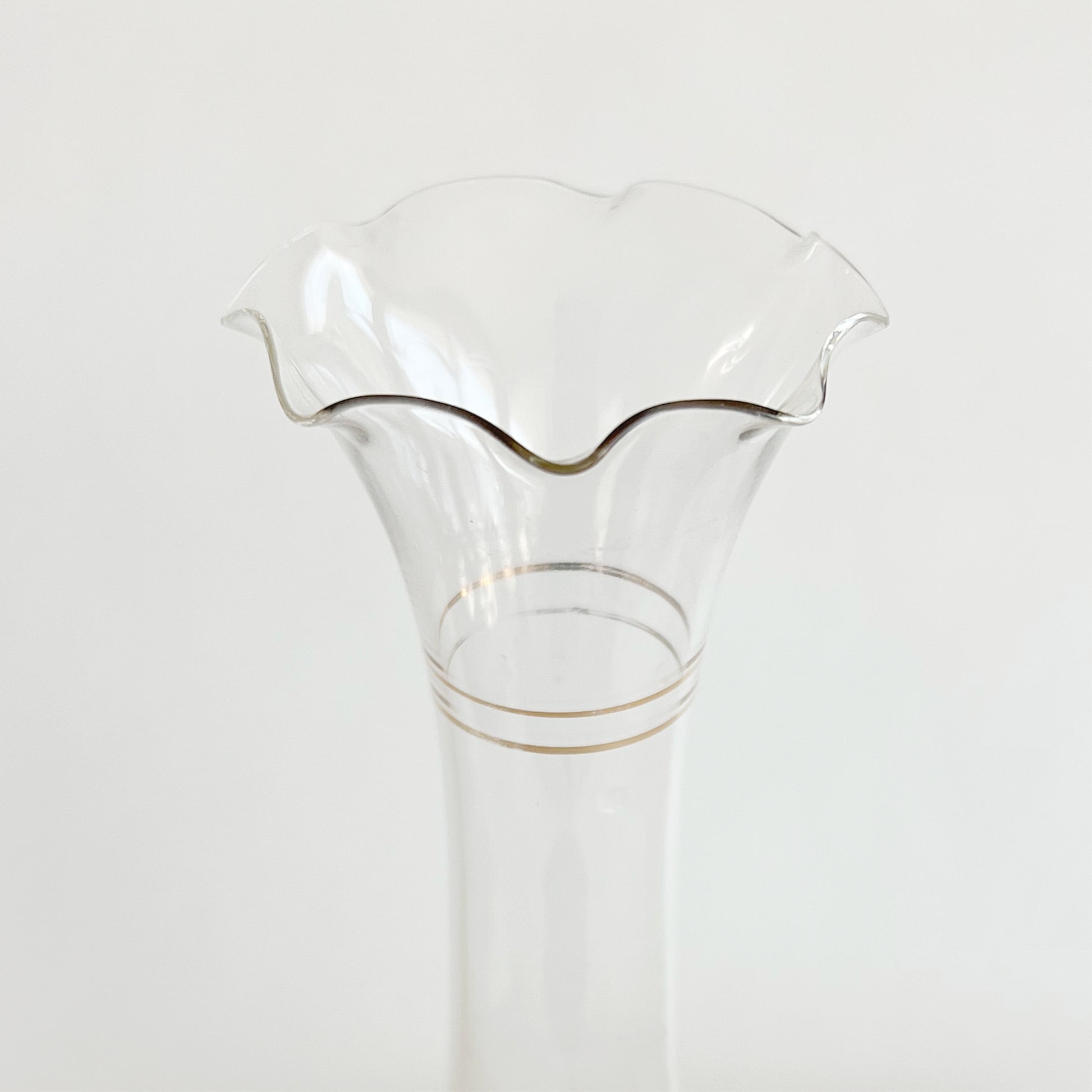With beautiful mid-century style and a slender sillouette, this Vintage Bud Vase has lovely gold stripes that add simple, refined detail. The gold, glass and ruffled edge catch the light beautifully. No visible damage to glass.