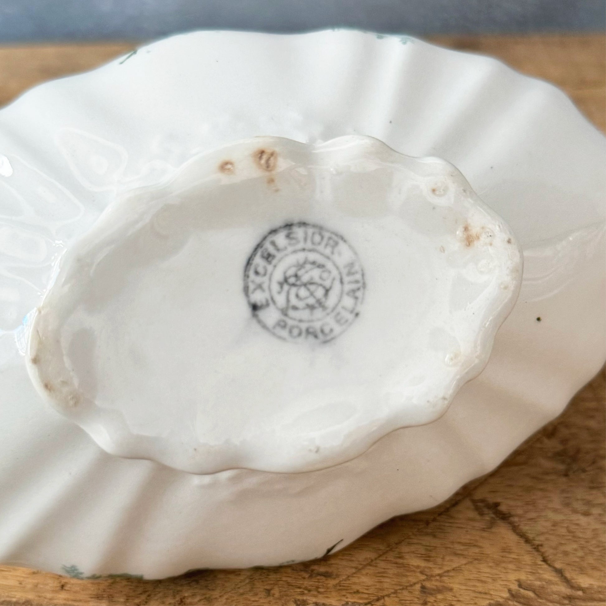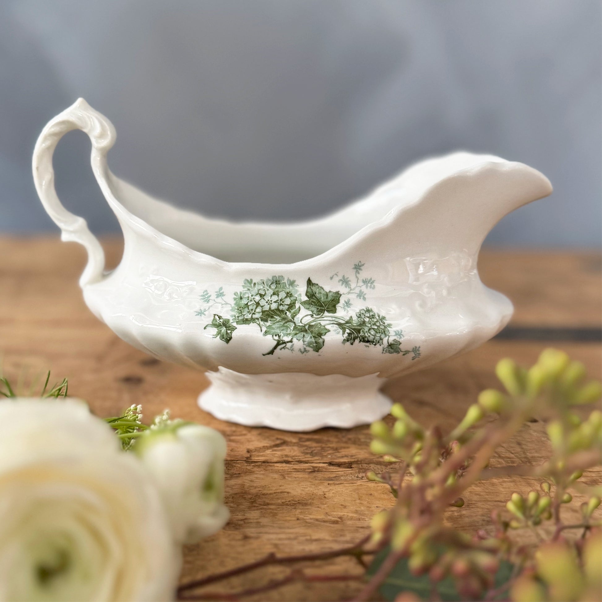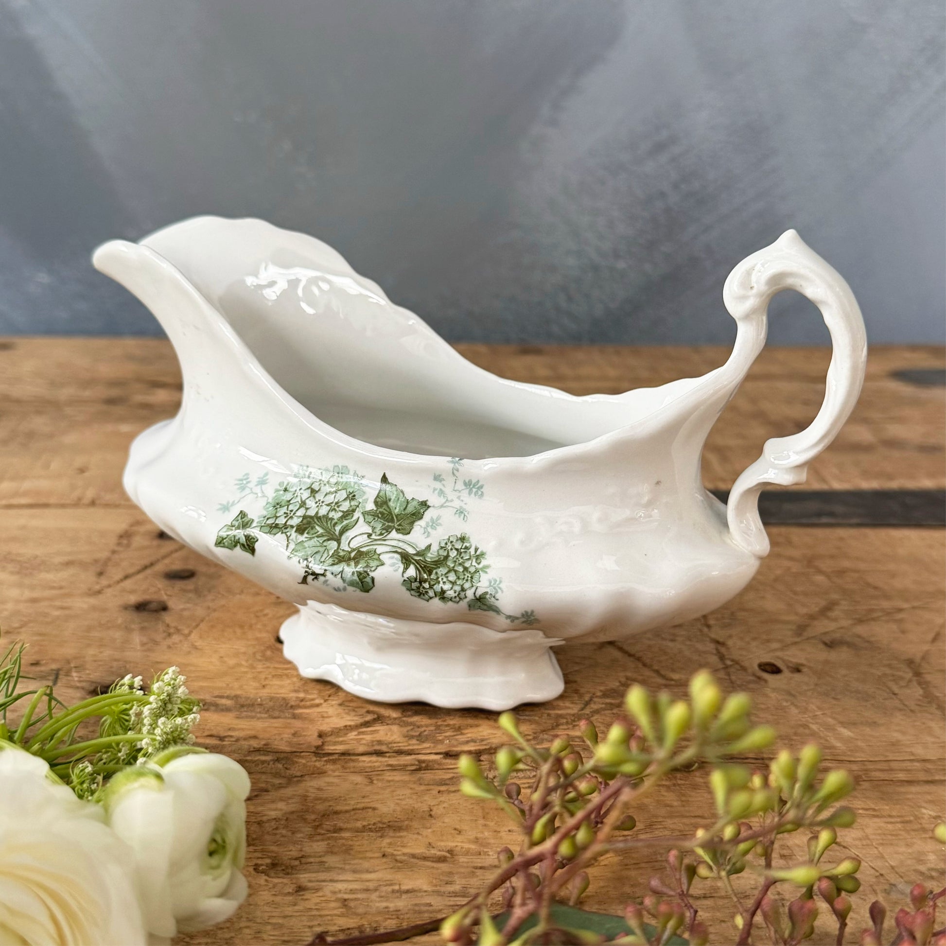 This charming Vintage Excelsior Porcelain Gravy Boat has a beautiful, ornate silhouette and details. In addition to the green ivy and floral pattern that repeats on both sides, there are raised scroll details around the front, back, and base. The scalloped rim and intricately scrolled handle make this a gorgeous yet functional piece for your holiday table or display.