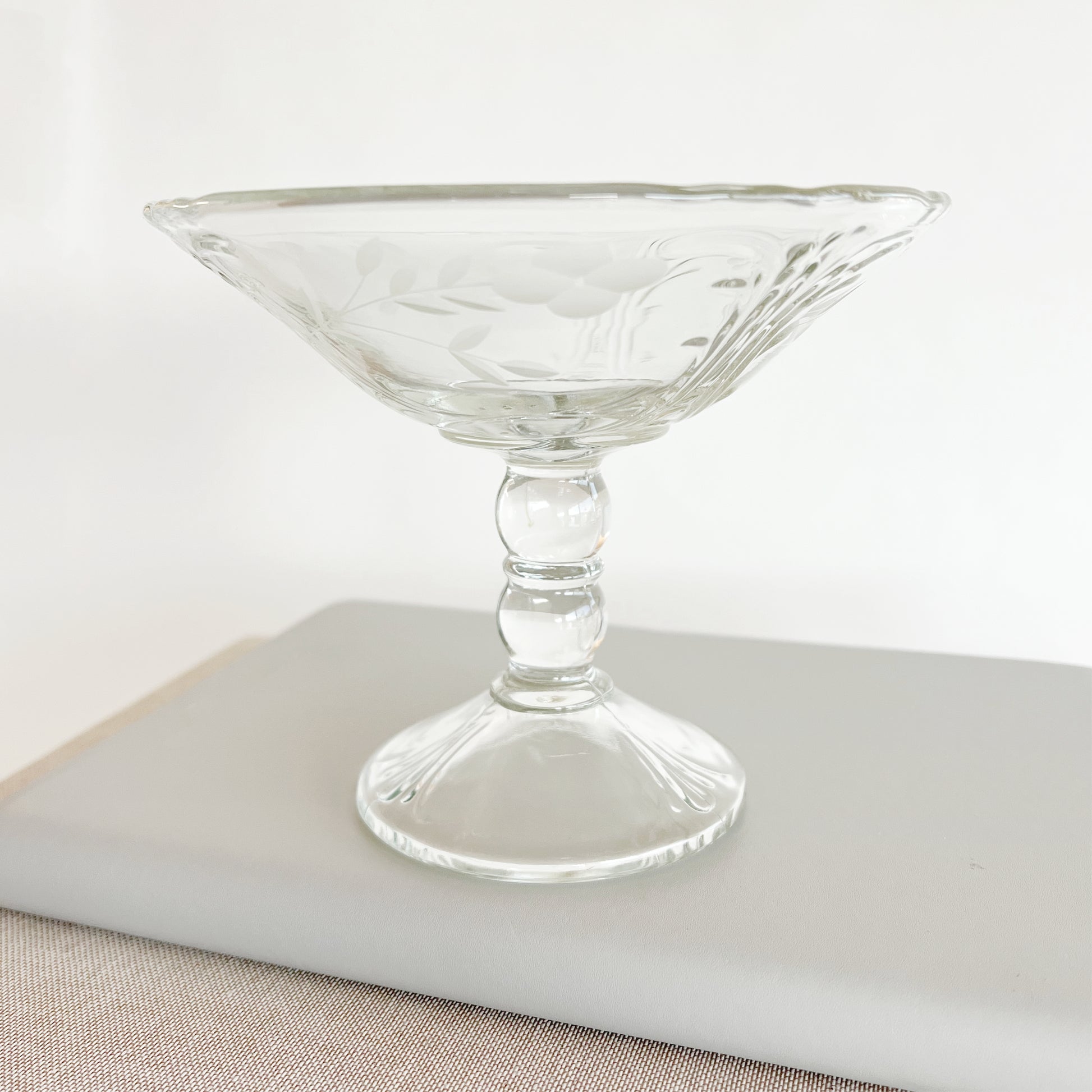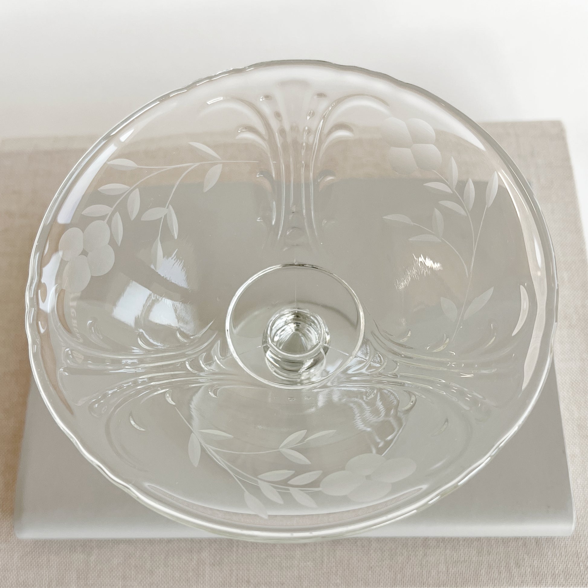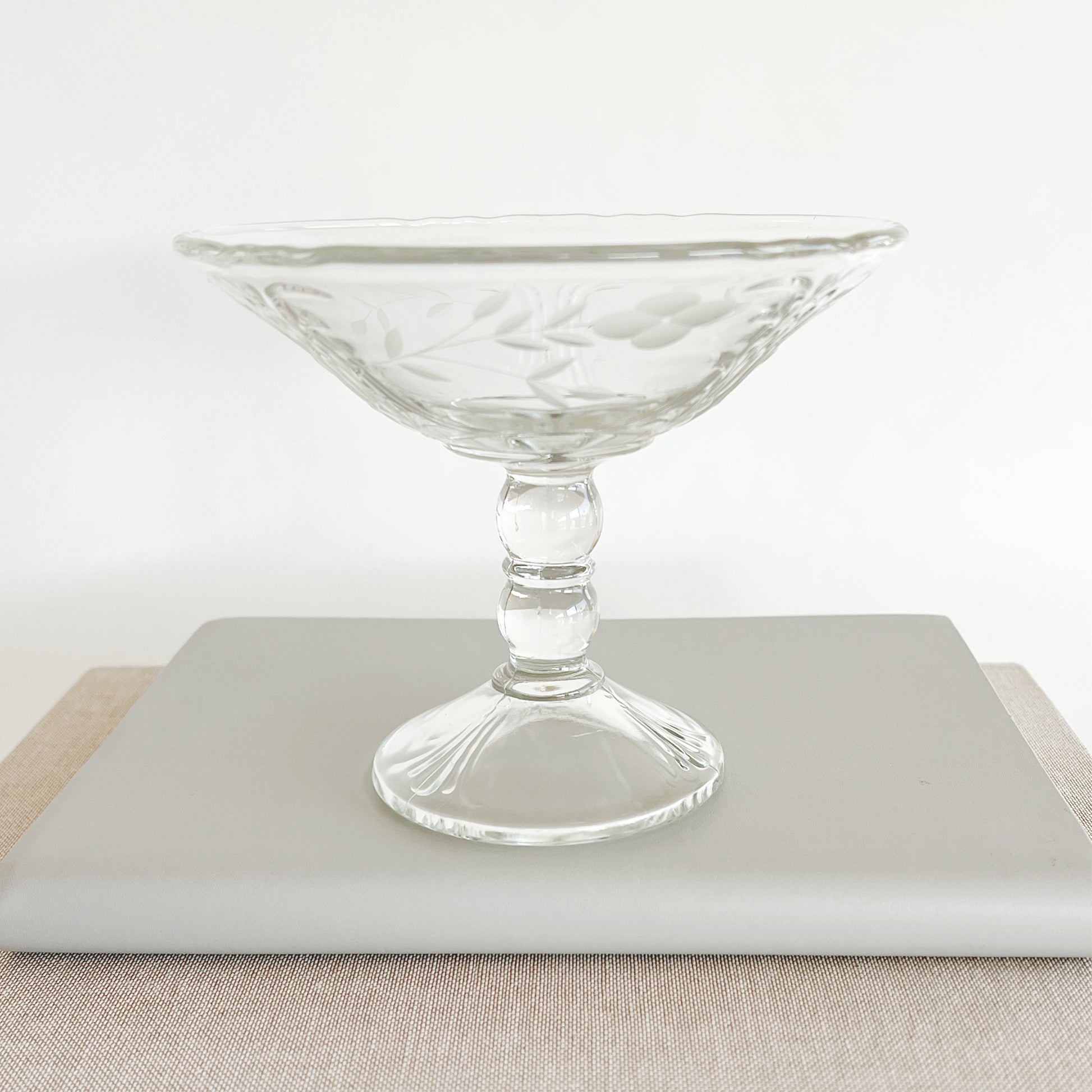 This beautiful Vintage Imperial Glass Compote dates from the 1940s. A sturdy piece with delicate floral cut details and a subtly ruffled rim. A great size for multiple uses, this compote is sure to add an elegant vintage touch to your home.