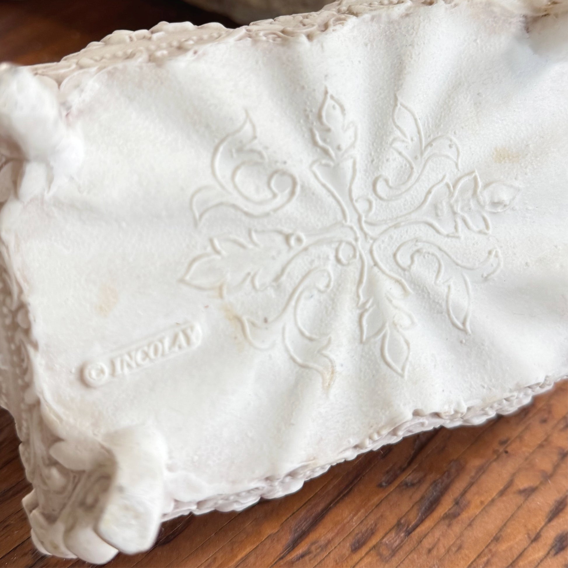 Add a touch of timeless elegance to your vanity with this stunning Vintage Incolay Stone Hinged Jewelry Box. Crafted with intricate hand-carved details that extend even to the underside, this box showcases a level of artistry that’s both delicate and refined. The creamy white shade enhances its vintage charm, making it a perfect addition to any collection or décor. Black felt lining in good condition and ready to house your treasures. A beautiful keepsake to cherish for years to come.
