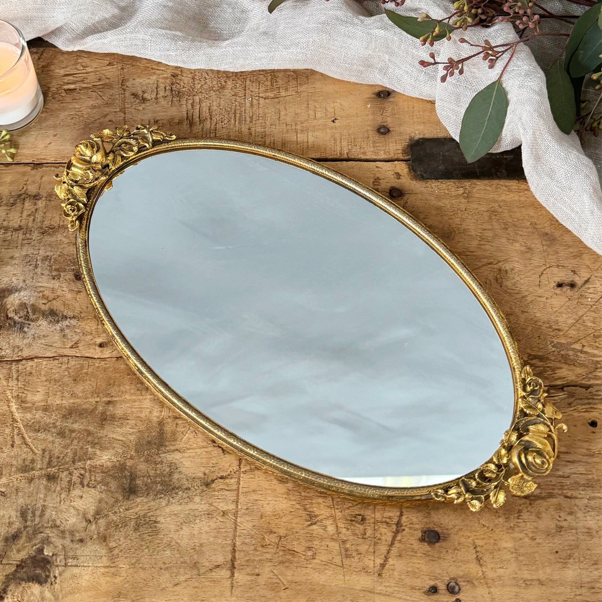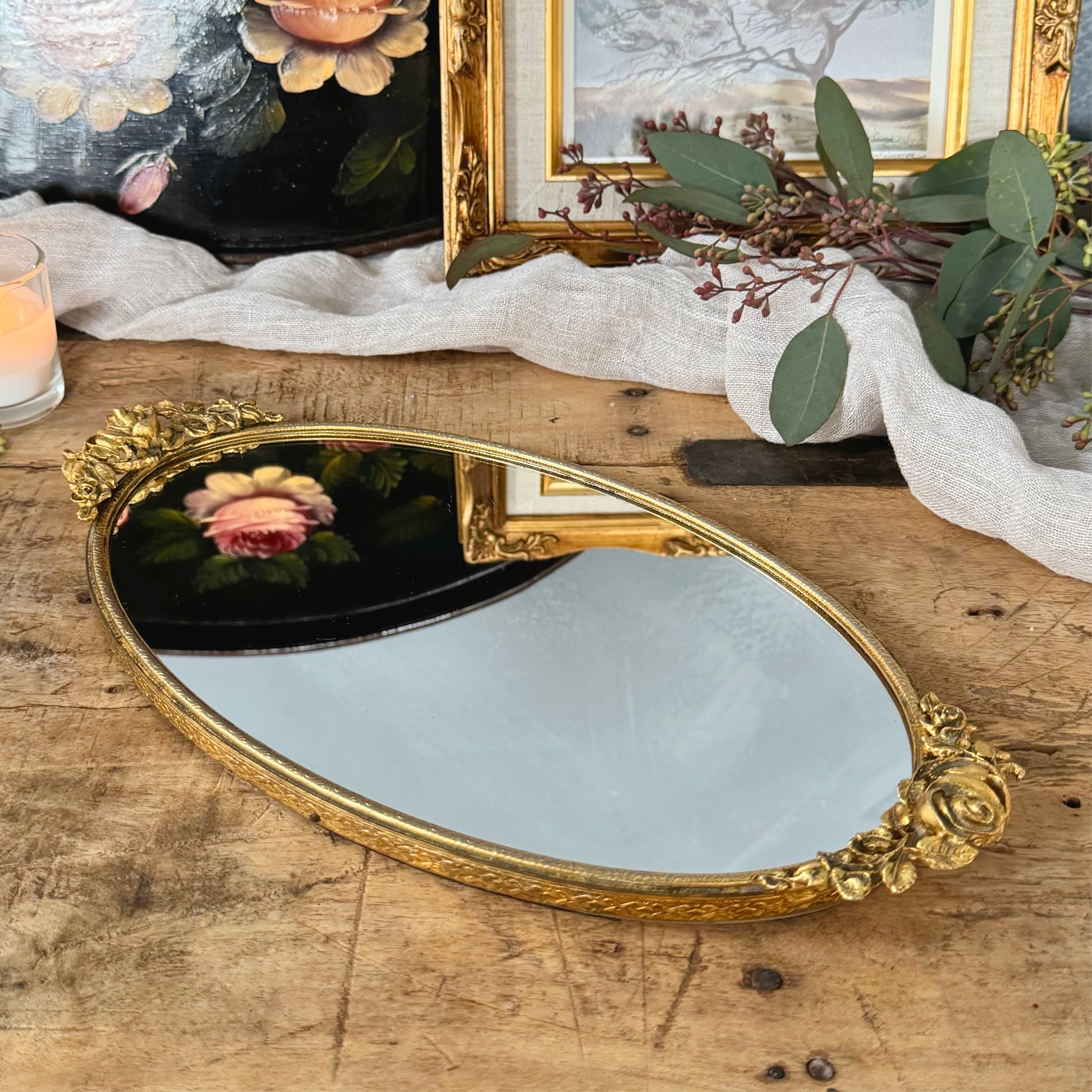 Vintage Matson Gold Ormolu Rose Vanity Mirror Tray