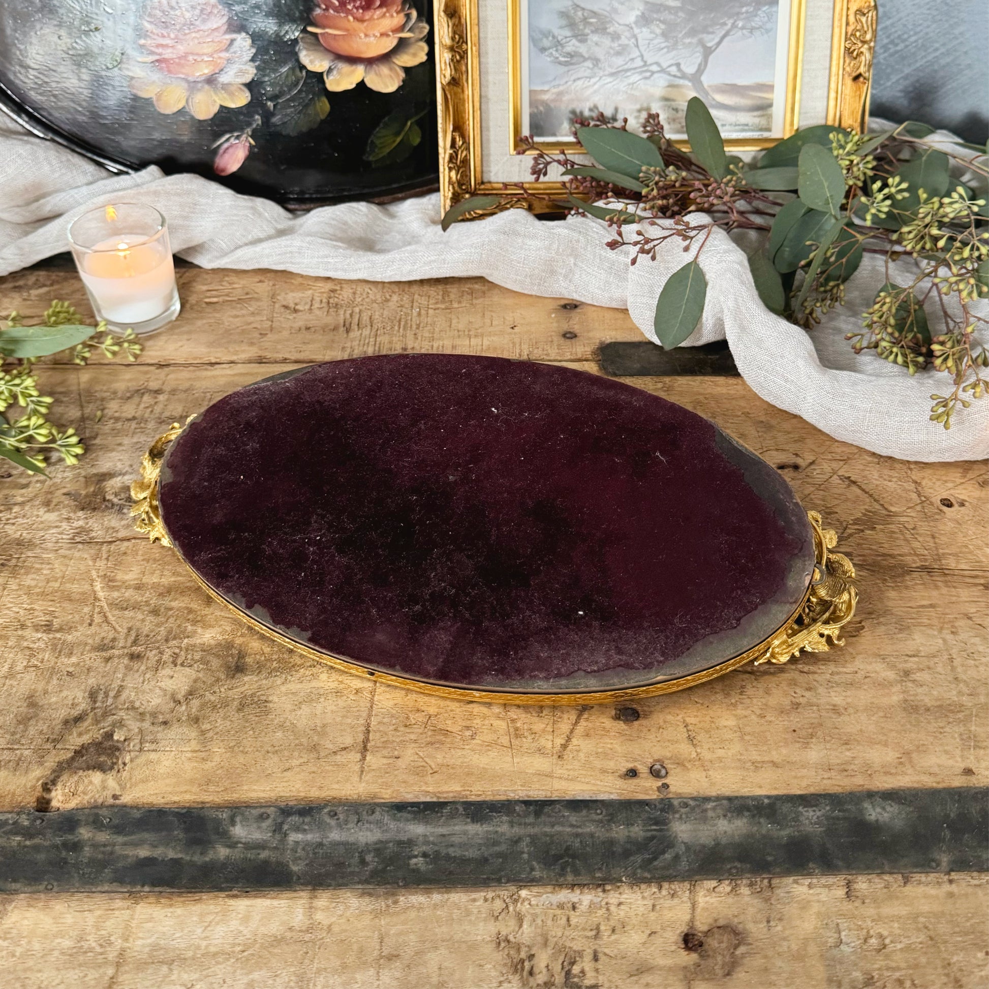 This beautiful Vintage Matson Gold Ormolu Rose Mirror Tray is the perfect anchor piece for your vanity or tablescape to highlight candles, stemware or jewelry. It has a beautiful gold detailed border and handles adorned with intricate rose details.
