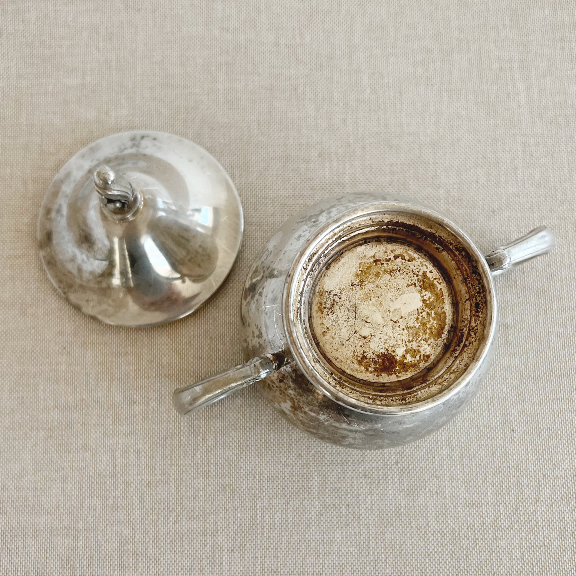 Charming Vintage Oneida Silver OHS372 (Silverplate, Hollowware) Lidded Sugar Bowl has a lovely shape and interesting details. Weathered patina almost mimics that of mercury glass, in our opinion. Lovely little piece to add to your collection.